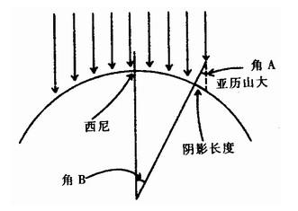 埃拉托斯尼自我思忖:为什么在西因的长竿不投下阴影,而同一时刻在北边的亚历山大的长竿却投下明显的阴影呢?假设在一幅古埃及的地图上有两根等长的垂竿,一根直立在亚历山大,另一根直立在西因。假定在某一个特定的时刻两根长竿都没有在地面上投下阴影,这一点很容易理解——只要地球是扁平的。这时候,太阳在头顶直射。如果两很长竿在地面上投下等长的阴影的话,在扁平的地球上也说得通:这个时候太阳光线以同样的角度斜射在这两根长竿上。但是在同一时刻,在西因没有阴影,而在亚历山大却有明显的阴影,这究竟是怎么一回事呢?
