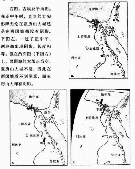 跟许多其他的发现一样,人类发现了地球是一个小星球。那是在古代的近东地区,在被一些人称为公元前三世纪的时代,在当时最大的城市——埃及的亚历山大发现的。在这个城市里住着一个名叫埃拉托斯尼的人,当时一个最羡慕他的人称他“贝塔(β)”——希腊文的第二个字母。这是因为,他说埃拉托斯尼是世界上第一个无所不知的人。但是埃拉托斯尼显然几乎在所有的领城里都是“阿尔法(α)”(希腊文的第一个字母)。他是一个天文学家、历史学家、地理学家、哲学家、诗人,戏剧批评家和数学家。他的著作从《天文学》到《痛解论》,样样都有。他还是亚历山大市图书馆的馆长。有一天,他从该馆的一本手抄本里读到下面—段话:在南部边疆西因前哨靠近尼罗河第一大瀑布的地方,在6月21日正午, 直立的长竿在地面上没有投下阴影。在夏至那天——一年当中白昼最长的一天,接近中午的时候,圣堂圆柱的阴影越来越短,最后在正午消失掉。这时太阳从头顶上直射下来,在一口深井的井水里可以看到太阳的倒影。